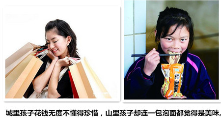 城里娃和山里娃从小经历的生活条件天差地别:城里娃是家里的小皇帝,父母只有一个心尖尖,自然是孩子要什么就给什么,得到的太容易,孩子就不懂得珍惜了;而山里娃不同,经济条件的限制使得父母对孩子的要求是有条件的满足,孩子知道世界不是围着自己转的,要珍惜现有的一切。
